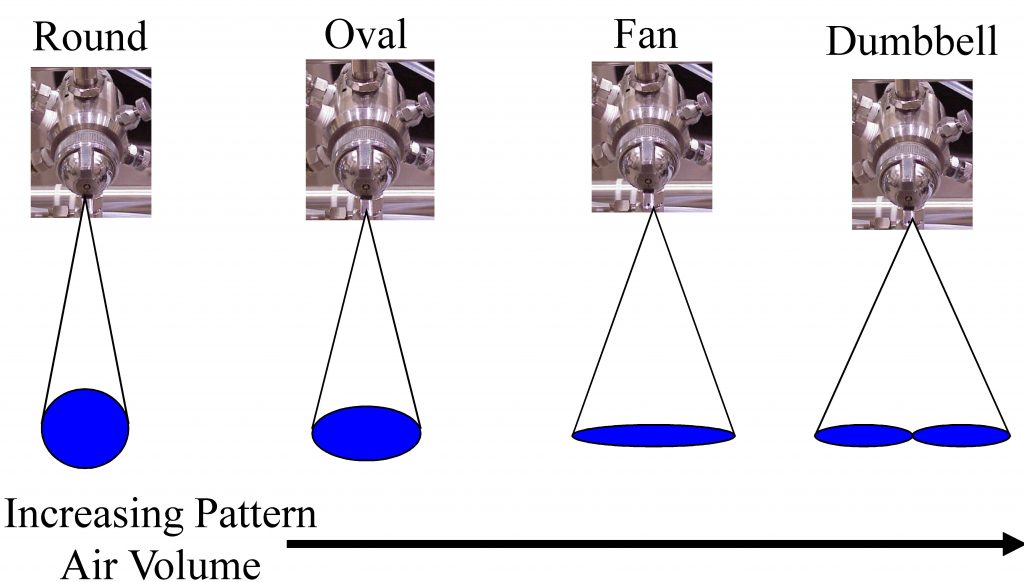 The illustration below shows the variety of spray patterns available at a constant atomization pressure. This is extremely important when using different coating materials or different starting pan loads.