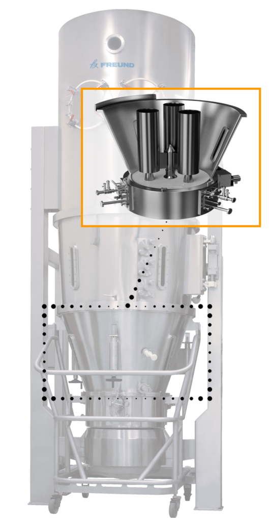 FREUND’s patented Wurster Accelerator System provides the fastest possible spray rates for Wurster coating processes. Compressed air diverts product away from the spray nozzle tip, optimizing product movement through the spray zone and minimizing agglomeration while improving coating quality, uniformity and coating times.