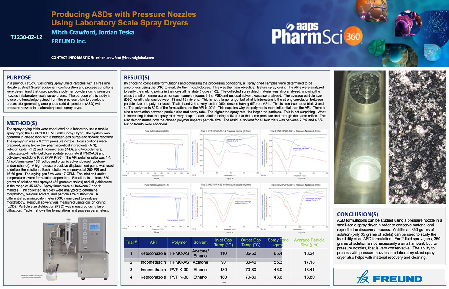 In a previous study, “Designing Spray Dried Particles with a Pressure Nozzle at Small Scale” equipment configuration and process conditions were determined that could produce polymer powders using pressure nozzles in laboratory scale spray dryers. The purpose of this study is to use the knowledge gained from the previous trials to develop a process for generating amorphous solid dispersions (ASD) with pressure nozzles in a laboratory scale spray dryer.