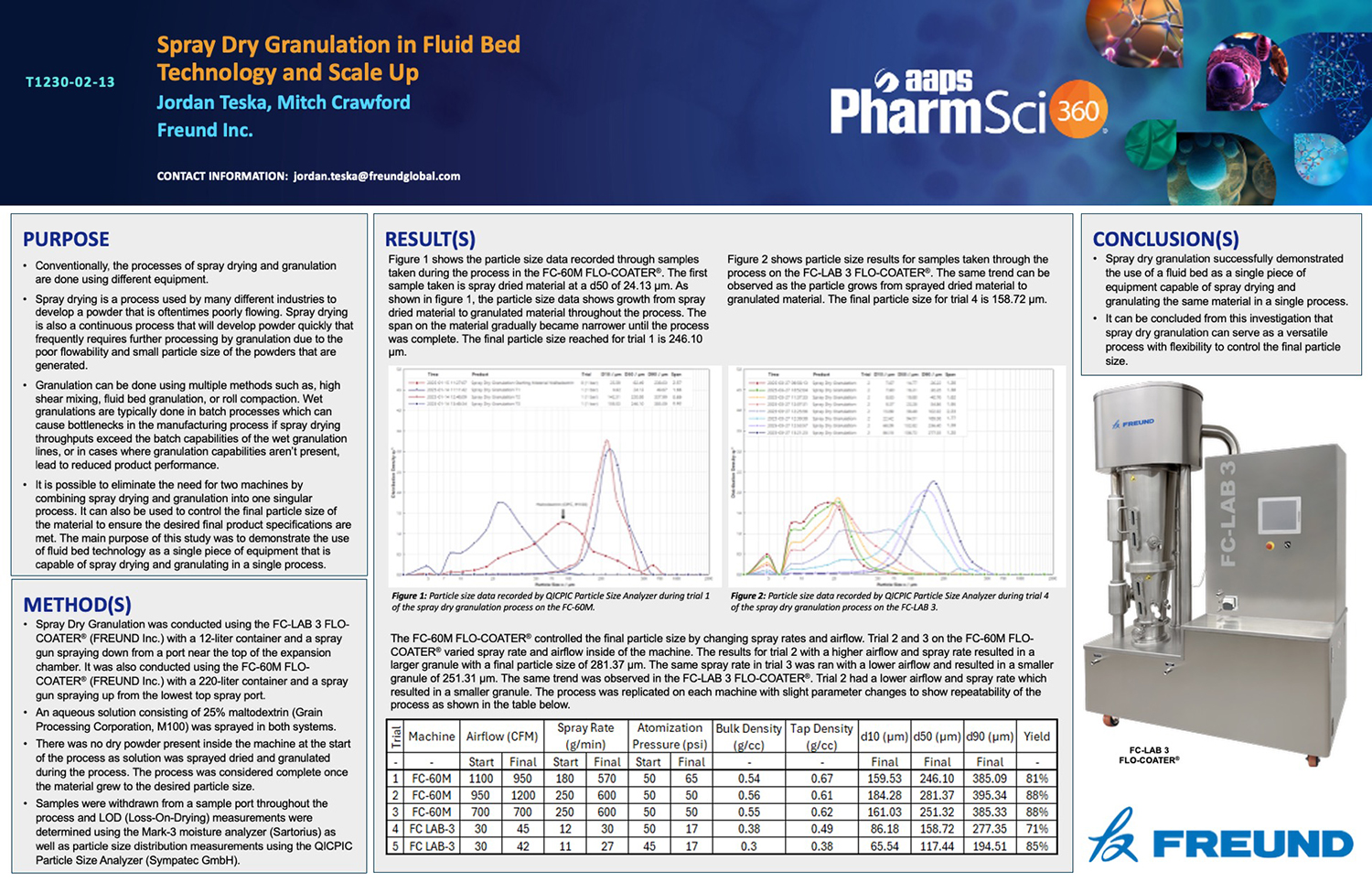 Granulation can be done using multiple methods such as, high shear mixing, fluid bed granulation, or roll compaction. Wet granulations are typically done in batch processes which can cause bottlenecks in the manufacturing process if spray drying throughputs exceed the batch capabilities of the wet granulation lines, or in cases where granulation capabilities aren’t present, lead to reduced product performance. It is possible to eliminate the need for two machines by combining spray drying and granulation into one singular process. It can also be used to control the final particle size of the material to ensure the desired final product specifications are met. The main purpose of this study was to demonstrate the use of fluid bed technology as a single piece of equipment that is capable of spray drying and granulating in a single process.